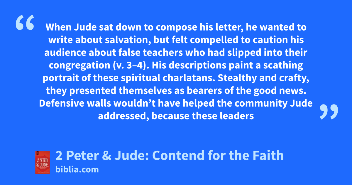 When Jude sat down to compose his letter, he wanted to write about salvation, but felt compelled to caution his audience about false teachers who had slipped into their congregation (v. 3–4). His descriptions paint a scathing portrait of these spiritual charlatans. Stealthy and crafty, they presented themselves as bearers of the good news. Defensive walls wouldn’t have helped the community Jude addressed, because these leaders