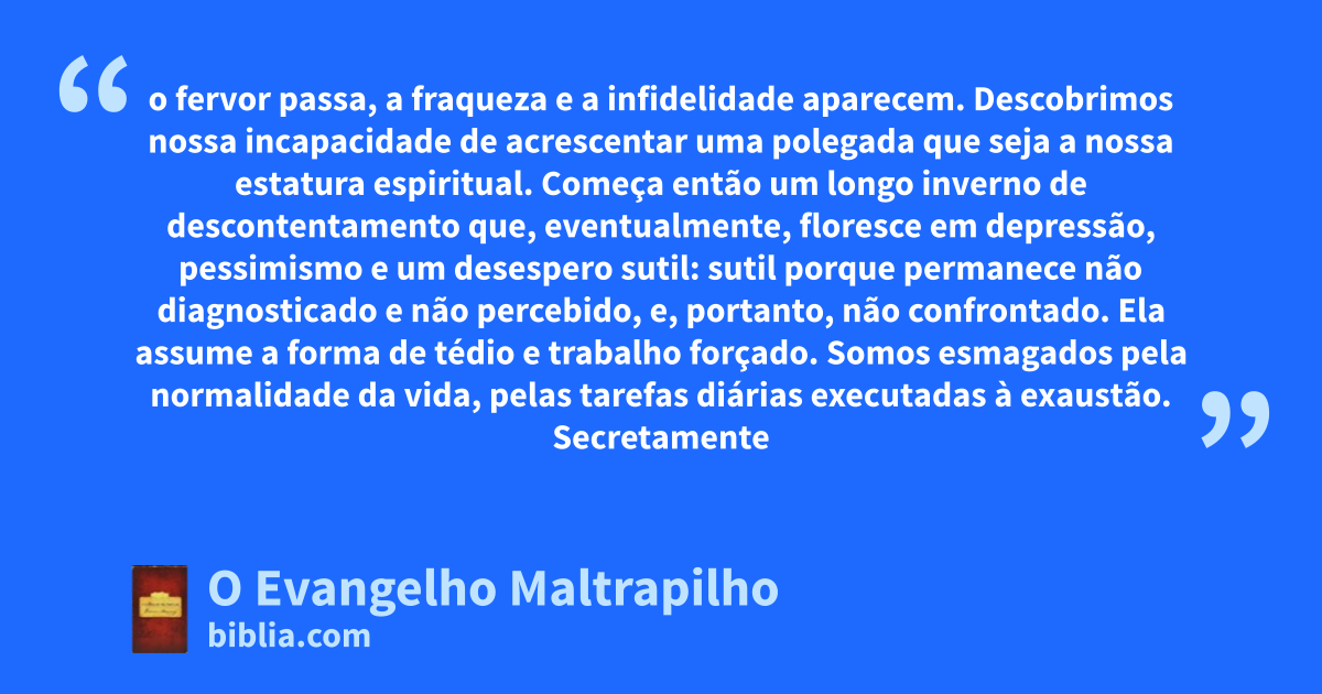 o fervor passa, a fraqueza e a infidelidade aparecem. Descobrimos nossa incapacidade de acrescentar uma polegada que seja a nossa estatura espiritual. Começa então um longo inverno de descontentamento que, eventualmente, floresce em depressão, pessimismo e um desespero sutil: sutil porque permanece não diagnosticado e não percebido, e, portanto, não confrontado. Ela assume a forma de tédio e trabalho forçado. Somos esmagados pela normalidade da vida, pelas tarefas diárias executadas à exaustão. Secretamente