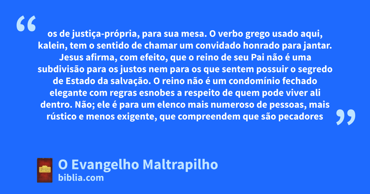 os de justiça-própria, para sua mesa. O verbo grego usado aqui, kalein, tem o sentido de chamar um convidado honrado para jantar. Jesus afirma, com efeito, que o reino de seu Pai não é uma subdivisão para os justos nem para os que sentem possuir o segredo de Estado da salvação. O reino não é um condomínio fechado elegante com regras esnobes a respeito de quem pode viver ali dentro. Não; ele é para um elenco mais numeroso de pessoas, mais rústico e menos exigente, que compreendem que são pecadores