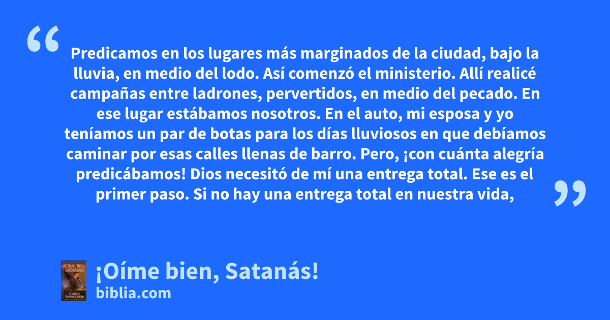Predicamos en los lugares más marginados de la ciudad, bajo la lluvia, en medio del lodo. Así comenzó el ministerio. Allí realicé campañas entre ladrones, pervertidos, en medio del pecado. En ese lugar estábamos nosotros. En el auto, mi esposa y yo teníamos un par de botas para los días lluviosos en que debíamos caminar por esas calles llenas de barro. Pero, ¡con cuánta alegría predicábamos! Dios necesitó de mí una entrega total. Ese es el primer paso. Si no hay una entrega total en nuestra vida,