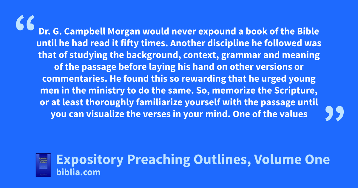 Dr. G. Campbell Morgan would never expound a book of the Bible until he had read it fifty times. Another discipline he followed was that of studying the background, context, grammar and meaning of the passage before laying his hand on other versions or commentaries. He found this so rewarding that he urged young men in the ministry to do the same. So, memorize the Scripture, or at least thoroughly familiarize yourself with the passage until you can visualize the verses in your mind. One of the values