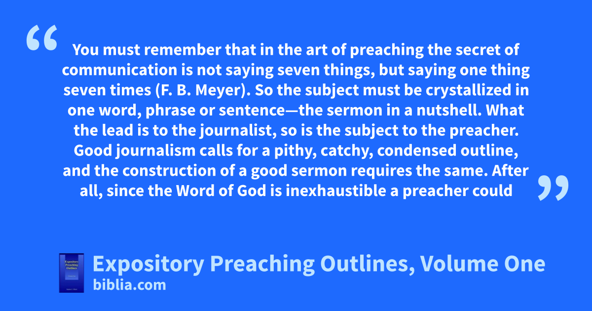 You must remember that in the art of preaching the secret of communication is not saying seven things, but saying one thing seven times (F. B. Meyer). So the subject must be crystallized in one word, phrase or sentence—the sermon in a nutshell. What the lead is to the journalist, so is the subject to the preacher. Good journalism calls for a pithy, catchy, condensed outline, and the construction of a good sermon requires the same. After all, since the Word of God is inexhaustible a preacher could