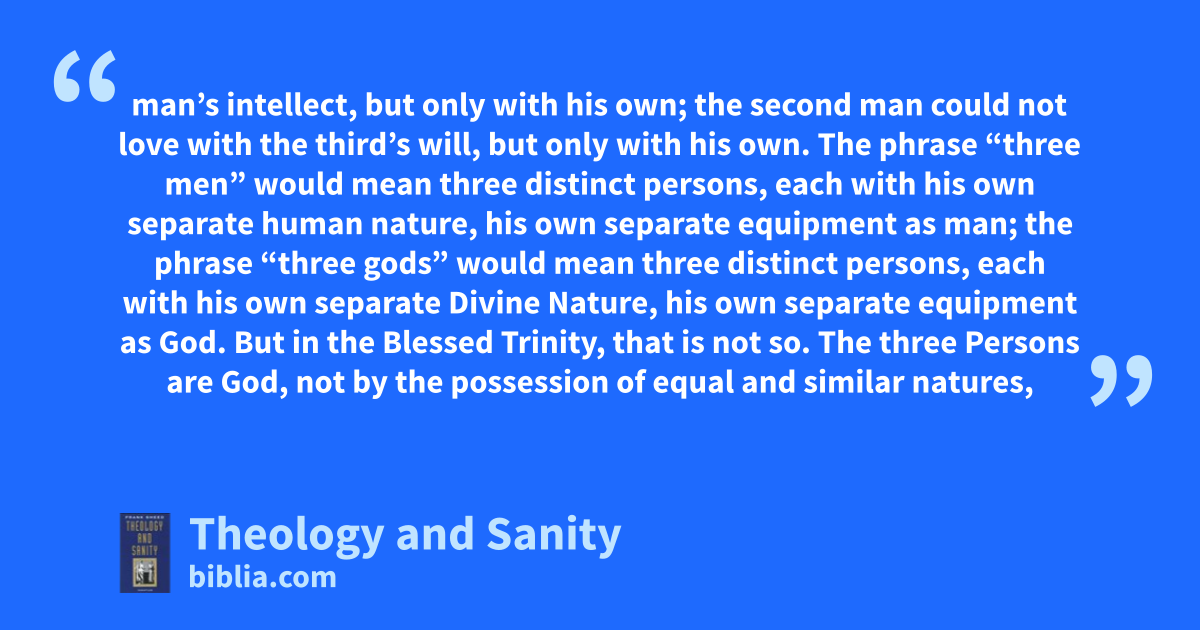 man’s intellect, but only with his own; the second man could not love with the third’s will, but only with his own. The phrase “three men” would mean three distinct persons, each with his own separate human nature, his own separate equipment as man; the phrase “three gods” would mean three distinct persons, each with his own separate Divine Nature, his own separate equipment as God. But in the Blessed Trinity, that is not so. The three Persons are God, not by the possession of equal and similar natures,