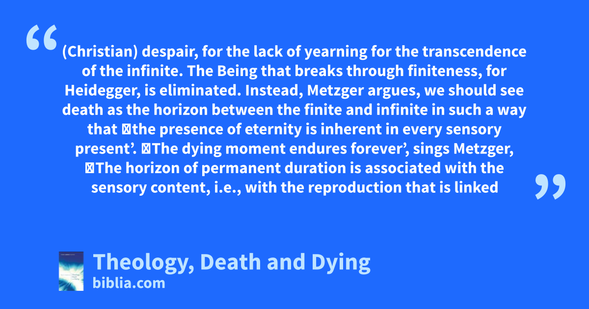 (Christian) despair, for the lack of yearning for the transcendence of the infinite. The Being that breaks through finiteness, for Heidegger, is eliminated. Instead, Metzger argues, we should see death as the horizon between the finite and infinite in such a way that ‛the presence of eternity is inherent in every sensory present’. ‛The dying moment endures forever’, sings Metzger, ‛The horizon of permanent duration is associated with the sensory content, i.e., with the reproduction that is linked
