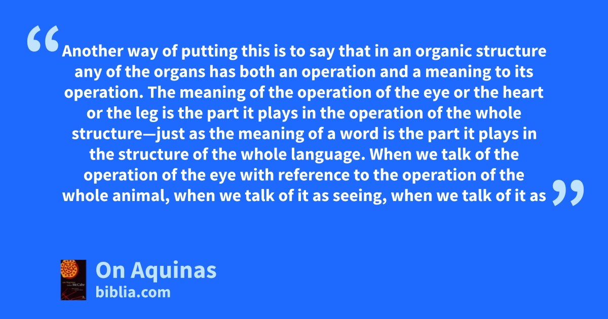 Another way of putting this is to say that in an organic structure any of the organs has both an operation and a meaning to its operation. The meaning of the operation of the eye or the heart or the leg is the part it plays in the operation of the whole structure—just as the meaning of a word is the part it plays in the structure of the whole language. When we talk of the operation of the eye with reference to the operation of the whole animal, when we talk of it as seeing, when we talk of it as