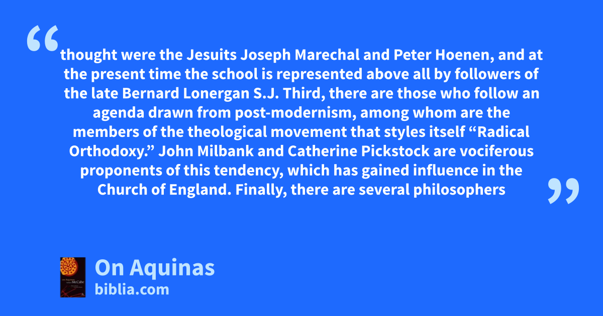 thought were the Jesuits Joseph Marechal and Peter Hoenen, and at the present time the school is represented above all by followers of the late Bernard Lonergan S.J. Third, there are those who follow an agenda drawn from post-modernism, among whom are the members of the theological movement that styles itself “Radical Orthodoxy.” John Milbank and Catherine Pickstock are vociferous proponents of this tendency, which has gained influence in the Church of England. Finally, there are several philosophers