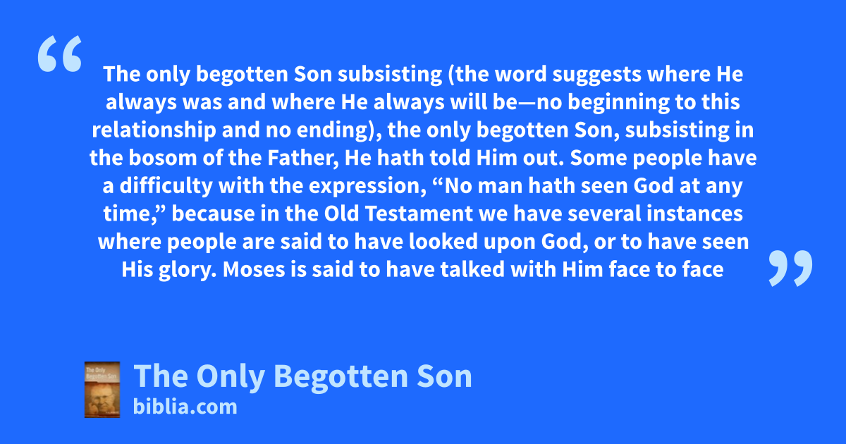 The only begotten Son subsisting (the word suggests where He always was and where He always will be—no beginning to this relationship and no ending), the only begotten Son, subsisting in the bosom of the Father, He hath told Him out. Some people have a difficulty with the expression, “No man hath seen God at any time,” because in the Old Testament we have several instances where people are said to have looked upon God, or to have seen His glory. Moses is said to have talked with Him face to face