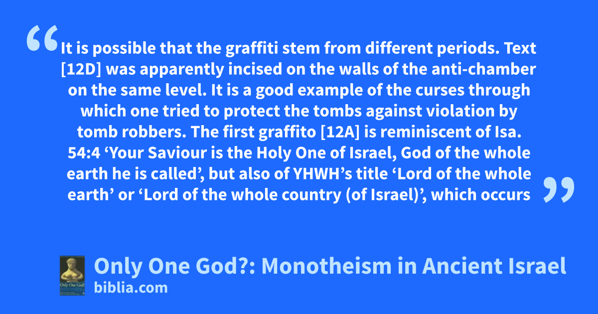 It is possible that the graffiti stem from different periods. Text [12D] was apparently incised on the walls of the anti-chamber on the same level. It is a good example of the curses through which one tried to protect the tombs against violation by tomb robbers. The first graffito [12A] is reminiscent of Isa. 54:4 ‘Your Saviour is the Holy One of Israel, God of the whole earth he is called’, but also of YHWH’s title ‘Lord of the whole earth’ or ‘Lord of the whole country (of Israel)’, which occurs