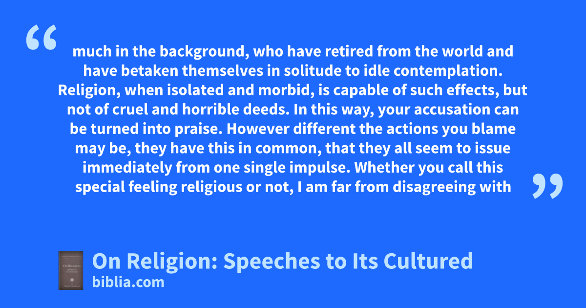 much in the background, who have retired from the world and have betaken themselves in solitude to idle contemplation. Religion, when isolated and morbid, is capable of such effects, but not of cruel and horrible deeds. In this way, your accusation can be turned into praise. However different the actions you blame may be, they have this in common, that they all seem to issue immediately from one single impulse. Whether you call this special feeling religious or not, I am far from disagreeing with