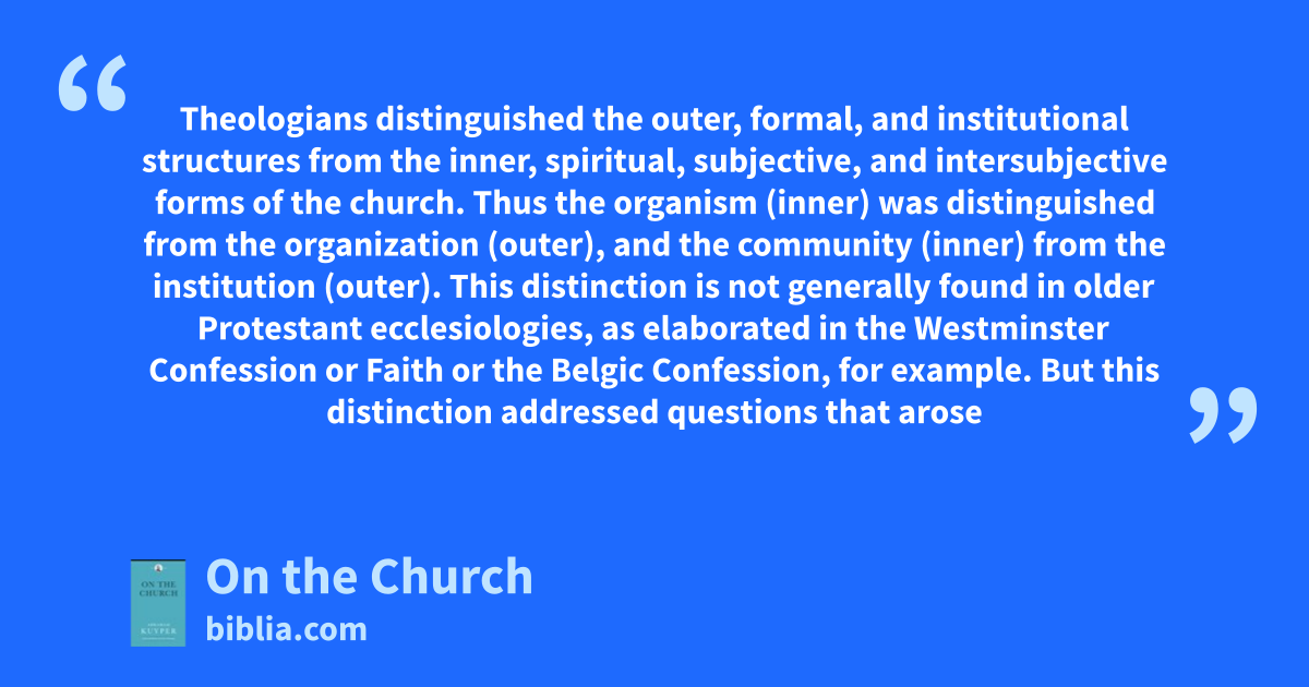 Theologians distinguished the outer, formal, and institutional structures from the inner, spiritual, subjective, and intersubjective forms of the church. Thus the organism (inner) was distinguished from the organization (outer), and the community (inner) from the institution (outer). This distinction is not generally found in older Protestant ecclesiologies, as elaborated in the Westminster Confession or Faith or the Belgic Confession, for example. But this distinction addressed questions that arose