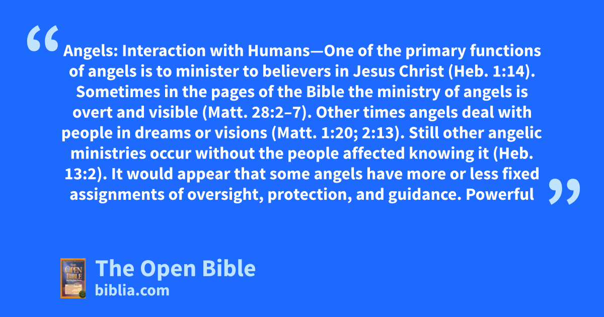 Angels: Interaction with Humans—One of the primary functions of angels is to minister to believers in Jesus Christ (Heb. 1:14). Sometimes in the pages of the Bible the ministry of angels is overt and visible (Matt. 28:2–7). Other times angels deal with people in dreams or visions (Matt. 1:20; 2:13). Still other angelic ministries occur without the people affected knowing it (Heb. 13:2). It would appear that some angels have more or less fixed assignments of oversight, protection, and guidance. Powerful