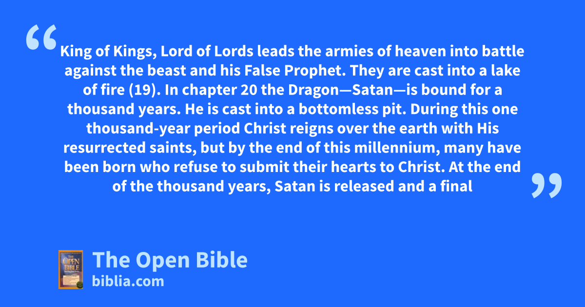King of Kings, Lord of Lords leads the armies of heaven into battle against the beast and his False Prophet. They are cast into a lake of fire (19). In chapter 20 the Dragon—Satan—is bound for a thousand years. He is cast into a bottomless pit. During this one thousand-year period Christ reigns over the earth with His resurrected saints, but by the end of this millennium, many have been born who refuse to submit their hearts to Christ. At the end of the thousand years, Satan is released and a final