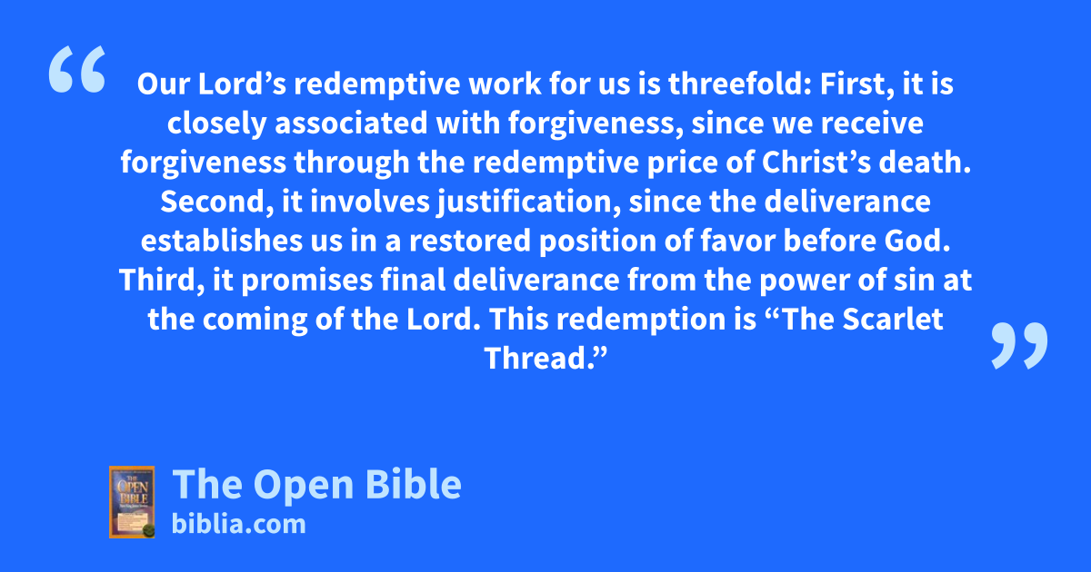 Our Lord’s redemptive work for us is threefold: First, it is closely associated with forgiveness, since we receive forgiveness through the redemptive price of Christ’s death. Second, it involves justification, since the deliverance establishes us in a restored position of favor before God. Third, it promises final deliverance from the power of sin at the coming of the Lord. This redemption is “The Scarlet Thread.”