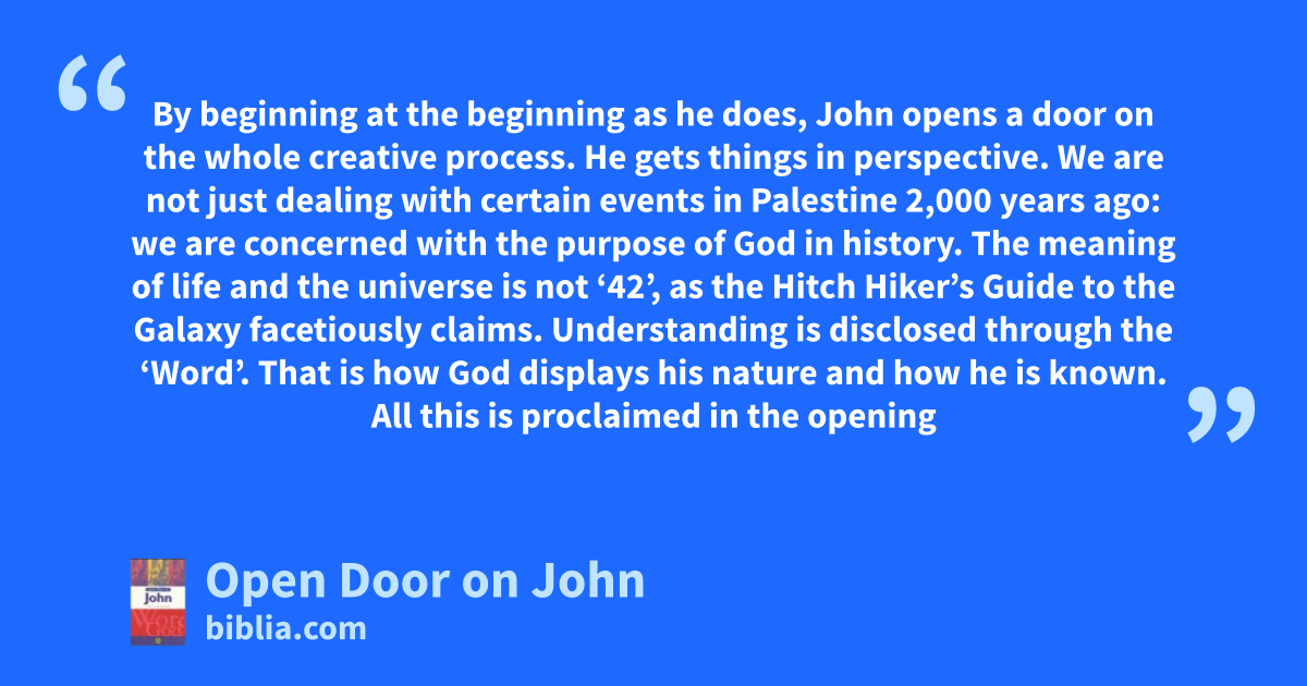 By beginning at the beginning as he does, John opens a door on the whole creative process. He gets things in perspective. We are not just dealing with certain events in Palestine 2,000 years ago: we are concerned with the purpose of God in history. The meaning of life and the universe is not ‘42’, as the Hitch Hiker’s Guide to the Galaxy facetiously claims. Understanding is disclosed through the ‘Word’. That is how God displays his nature and how he is known. All this is proclaimed in the opening