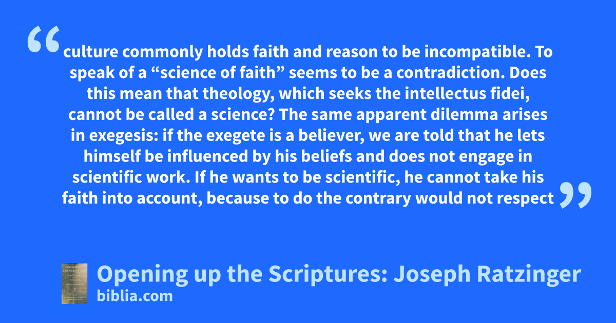 culture commonly holds faith and reason to be incompatible. To speak of a “science of faith” seems to be a contradiction. Does this mean that theology, which seeks the intellectus fidei, cannot be called a science? The same apparent dilemma arises in exegesis: if the exegete is a believer, we are told that he lets himself be influenced by his beliefs and does not engage in scientific work. If he wants to be scientific, he cannot take his faith into account, because to do the contrary would not respect