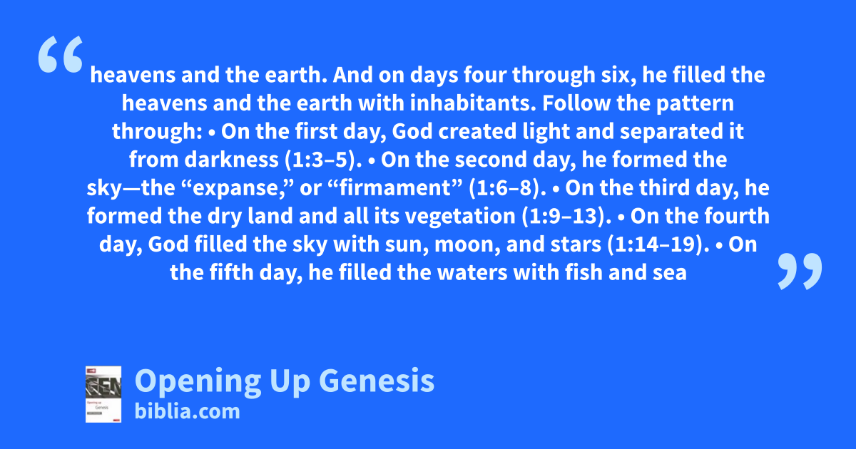 heavens and the earth. And on days four through six, he filled the heavens and the earth with inhabitants. Follow the pattern through: • On the first day, God created light and separated it from darkness (1:3–5). • On the second day, he formed the sky—the “expanse,” or “firmament” (1:6–8). • On the third day, he formed the dry land and all its vegetation (1:9–13). • On the fourth day, God filled the sky with sun, moon, and stars (1:14–19). • On the fifth day, he filled the waters with fish and sea