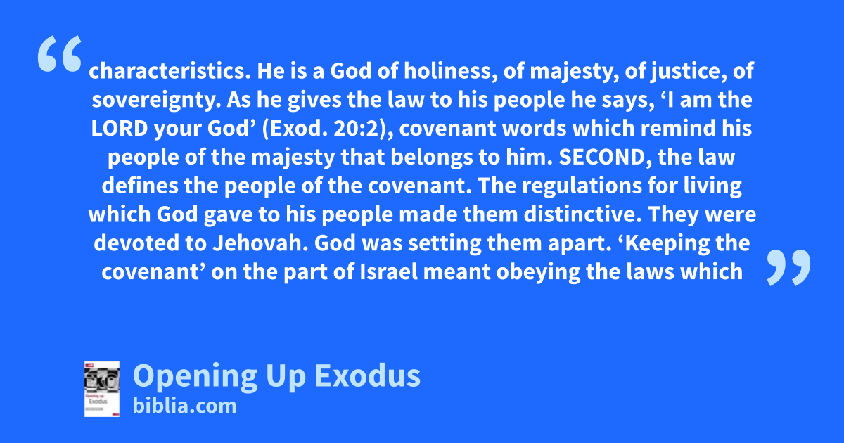 characteristics. He is a God of holiness, of majesty, of justice, of sovereignty. As he gives the law to his people he says, ‘I am the LORD your God’ (Exod. 20:2), covenant words which remind his people of the majesty that belongs to him. SECOND, the law defines the people of the covenant. The regulations for living which God gave to his people made them distinctive. They were devoted to Jehovah. God was setting them apart. ‘Keeping the covenant’ on the part of Israel meant obeying the laws which