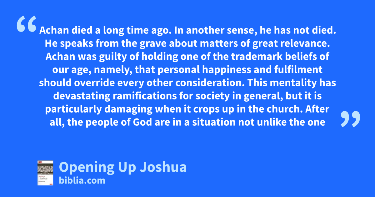 Achan died a long time ago. In another sense, he has not died. He speaks from the grave about matters of great relevance. Achan was guilty of holding one of the trademark beliefs of our age, namely, that personal happiness and fulfilment should override every other consideration. This mentality has devastating ramifications for society in general, but it is particularly damaging when it crops up in the church. After all, the people of God are in a situation not unlike the one