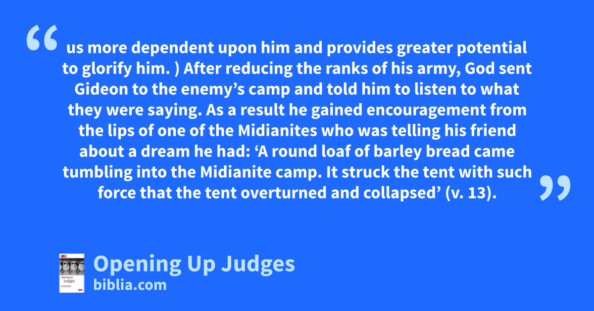 us more dependent upon him and provides greater potential to glorify him. ) After reducing the ranks of his army, God sent Gideon to the enemy’s camp and told him to listen to what they were saying. As a result he gained encouragement from the lips of one of the Midianites who was telling his friend about a dream he had: ‘A round loaf of barley bread came tumbling into the Midianite camp. It struck the tent with such force that the tent overturned and collapsed’ (v. 13).