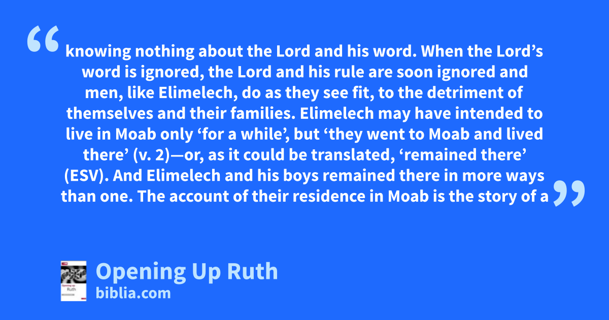 knowing nothing about the Lord and his word. When the Lord’s word is ignored, the Lord and his rule are soon ignored and men, like Elimelech, do as they see fit, to the detriment of themselves and their families. Elimelech may have intended to live in Moab only ‘for a while’, but ‘they went to Moab and lived there’ (v. 2)—or, as it could be translated, ‘remained there’ (ESV). And Elimelech and his boys remained there in more ways than one. The account of their residence in Moab is the story of a