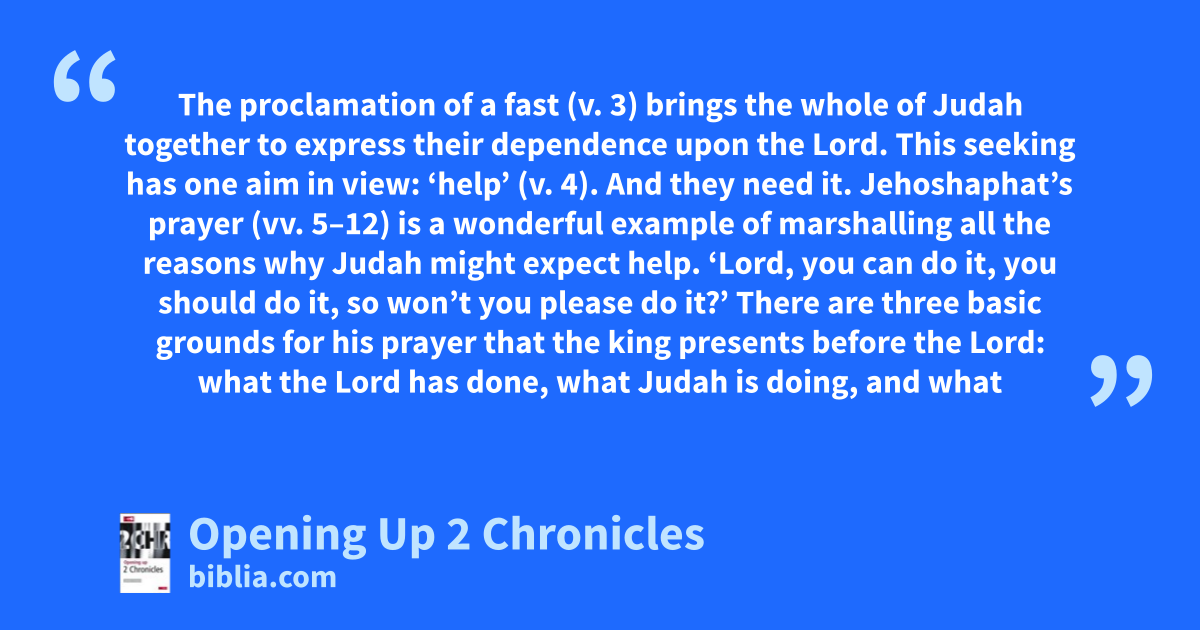 The proclamation of a fast (v. 3) brings the whole of Judah together to express their dependence upon the Lord. This seeking has one aim in view: ‘help’ (v. 4). And they need it. Jehoshaphat’s prayer (vv. 5–12) is a wonderful example of marshalling all the reasons why Judah might expect help. ‘Lord, you can do it, you should do it, so won’t you please do it?’ There are three basic grounds for his prayer that the king presents before the Lord: what the Lord has done, what Judah is doing, and what