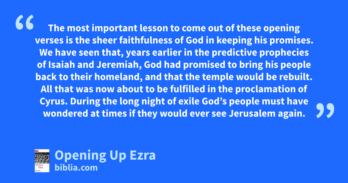 The most important lesson to come out of these opening verses is the sheer faithfulness of God in keeping his promises. We have seen that, years earlier in the predictive prophecies of Isaiah and Jeremiah, God had promised to bring his people back to their homeland, and that the temple would be rebuilt. All that was now about to be fulfilled in the proclamation of Cyrus. During the long night of exile God’s people must have wondered at times if they would ever see Jerusalem again.