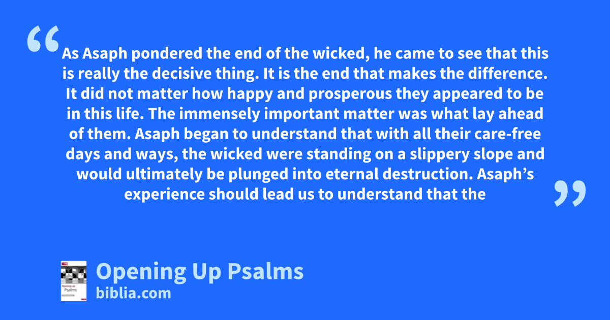 As Asaph pondered the end of the wicked, he came to see that this is really the decisive thing. It is the end that makes the difference. It did not matter how happy and prosperous they appeared to be in this life. The immensely important matter was what lay ahead of them. Asaph began to understand that with all their care-free days and ways, the wicked were standing on a slippery slope and would ultimately be plunged into eternal destruction. Asaph’s experience should lead us to understand that the