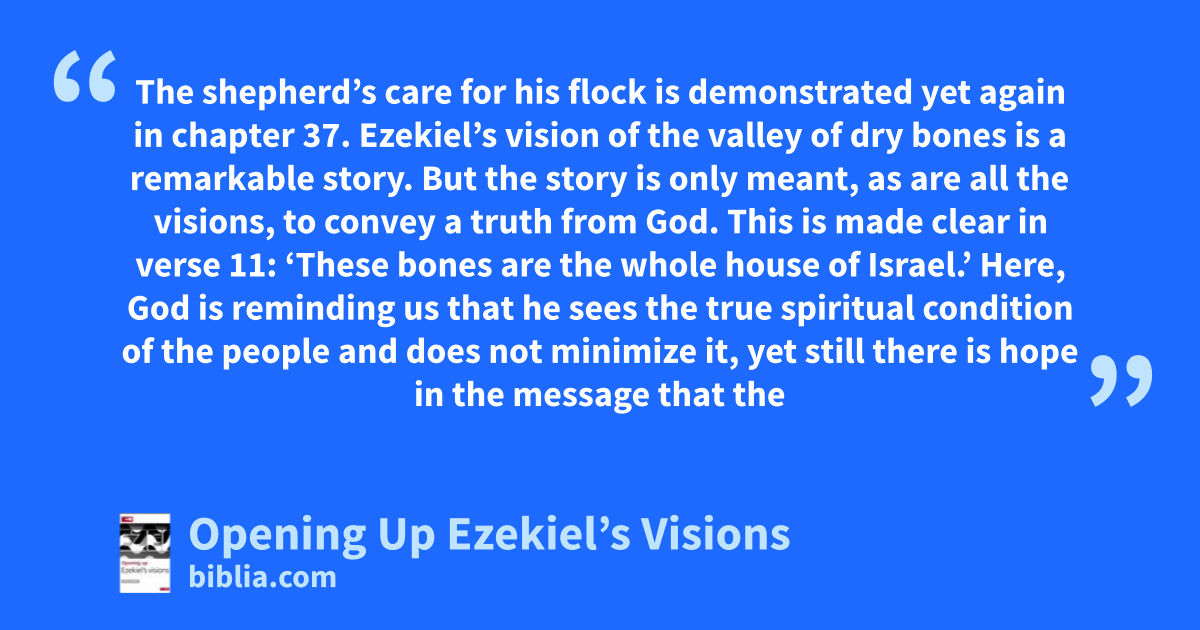 The shepherd’s care for his flock is demonstrated yet again in chapter 37. Ezekiel’s vision of the valley of dry bones is a remarkable story. But the story is only meant, as are all the visions, to convey a truth from God. This is made clear in verse 11: ‘These bones are the whole house of Israel.’ Here, God is reminding us that he sees the true spiritual condition of the people and does not minimize it, yet still there is hope in the message that the