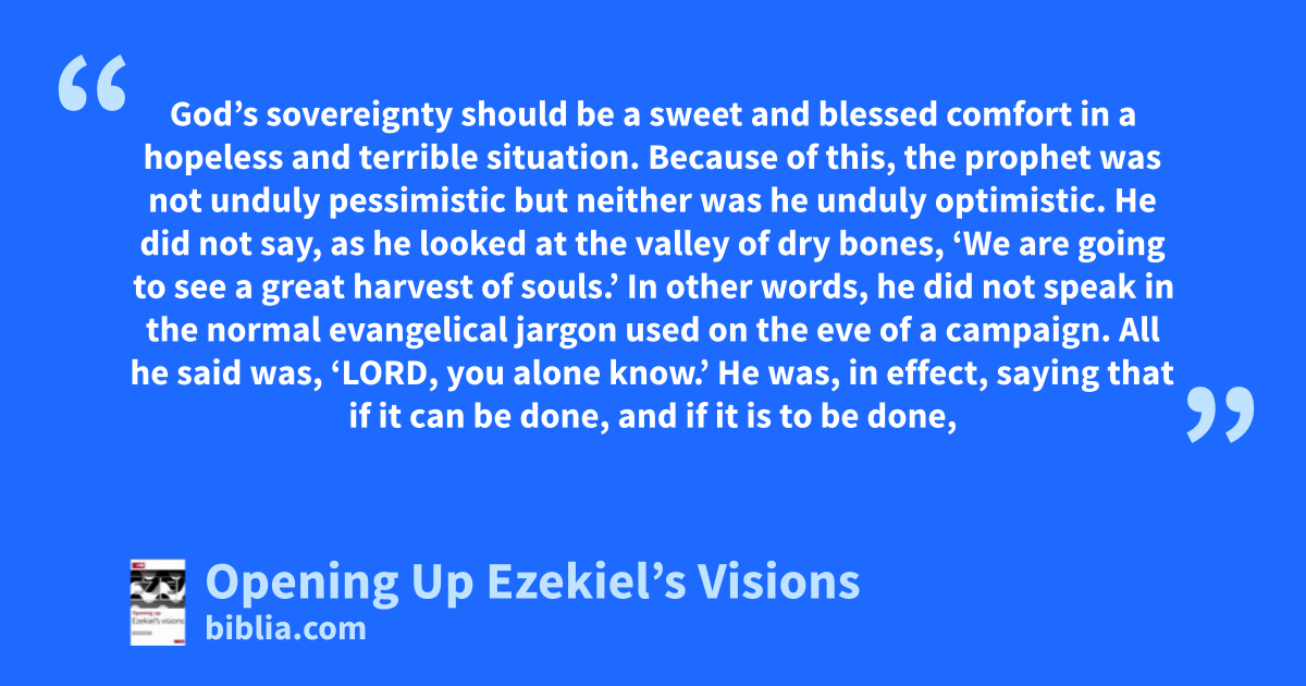 God’s sovereignty should be a sweet and blessed comfort in a hopeless and terrible situation. Because of this, the prophet was not unduly pessimistic but neither was he unduly optimistic. He did not say, as he looked at the valley of dry bones, ‘We are going to see a great harvest of souls.’ In other words, he did not speak in the normal evangelical jargon used on the eve of a campaign. All he said was, ‘LORD, you alone know.’ He was, in effect, saying that if it can be done, and if it is to be done,