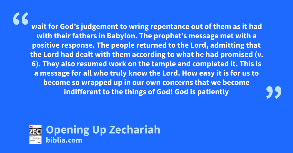 wait for God’s judgement to wring repentance out of them as it had with their fathers in Babylon. The prophet’s message met with a positive response. The people returned to the Lord, admitting that the Lord had dealt with them according to what he had promised (v. 6). They also resumed work on the temple and completed it. This is a message for all who truly know the Lord. How easy it is for us to become so wrapped up in our own concerns that we become indifferent to the things of God! God is patiently
