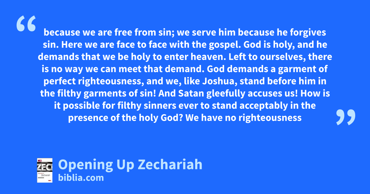 because we are free from sin; we serve him because he forgives sin. Here we are face to face with the gospel. God is holy, and he demands that we be holy to enter heaven. Left to ourselves, there is no way we can meet that demand. God demands a garment of perfect righteousness, and we, like Joshua, stand before him in the filthy garments of sin! And Satan gleefully accuses us! How is it possible for filthy sinners ever to stand acceptably in the presence of the holy God? We have no righteousness