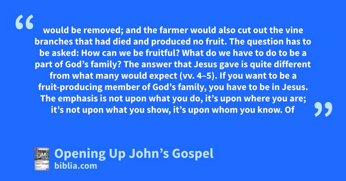 would be removed; and the farmer would also cut out the vine branches that had died and produced no fruit. The question has to be asked: How can we be fruitful? What do we have to do to be a part of God’s family? The answer that Jesus gave is quite different from what many would expect (vv. 4–5). If you want to be a fruit-producing member of God’s family, you have to be in Jesus. The emphasis is not upon what you do, it’s upon where you are; it’s not upon what you show, it’s upon whom you know. Of