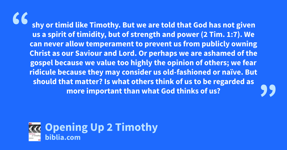 shy or timid like Timothy. But we are told that God has not given us a spirit of timidity, but of strength and power (2 Tim. 1:7). We can never allow temperament to prevent us from publicly owning Christ as our Saviour and Lord. Or perhaps we are ashamed of the gospel because we value too highly the opinion of others; we fear ridicule because they may consider us old-fashioned or naïve. But should that matter? Is what others think of us to be regarded as more important than what God thinks of us?