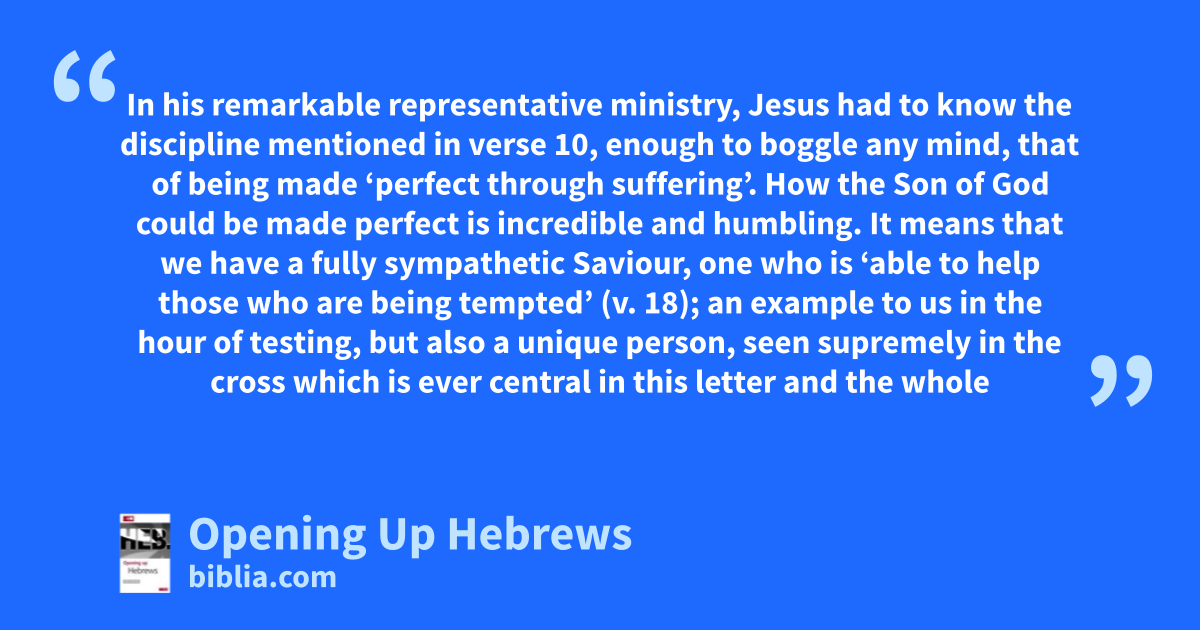 In his remarkable representative ministry, Jesus had to know the discipline mentioned in verse 10, enough to boggle any mind, that of being made ‘perfect through suffering’. How the Son of God could be made perfect is incredible and humbling. It means that we have a fully sympathetic Saviour, one who is ‘able to help those who are being tempted’ (v. 18); an example to us in the hour of testing, but also a unique person, seen supremely in the cross which is ever central in this letter and the whole