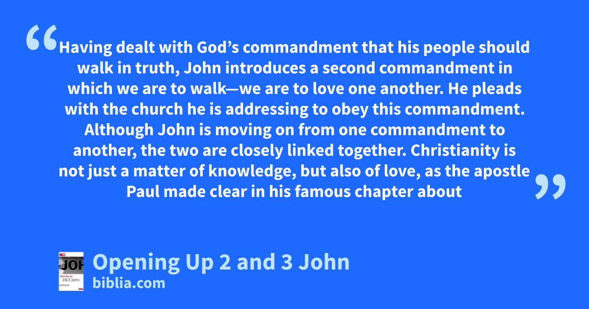 Having dealt with God’s commandment that his people should walk in truth, John introduces a second commandment in which we are to walk—we are to love one another. He pleads with the church he is addressing to obey this commandment. Although John is moving on from one commandment to another, the two are closely linked together. Christianity is not just a matter of knowledge, but also of love, as the apostle Paul made clear in his famous chapter about