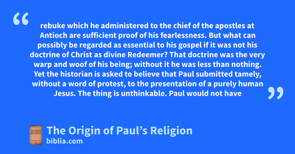 rebuke which he administered to the chief of the apostles at Antioch are sufficient proof of his fearlessness. But what can possibly be regarded as essential to his gospel if it was not his doctrine of Christ as divine Redeemer? That doctrine was the very warp and woof of his being; without it he was less than nothing. Yet the historian is asked to believe that Paul submitted tamely, without a word of protest, to the presentation of a purely human Jesus. The thing is unthinkable. Paul would not have