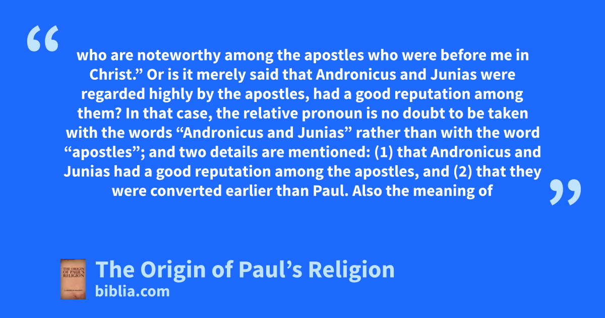 who are noteworthy among the apostles who were before me in Christ.” Or is it merely said that Andronicus and Junias were regarded highly by the apostles, had a good reputation among them? In that case, the relative pronoun is no doubt to be taken with the words “Andronicus and Junias” rather than with the word “apostles”; and two details are mentioned: (1) that Andronicus and Junias had a good reputation among the apostles, and (2) that they were converted earlier than Paul. Also the meaning of