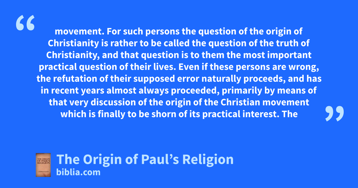 movement. For such persons the question of the origin of Christianity is rather to be called the question of the truth of Christianity, and that question is to them the most important practical question of their lives. Even if these persons are wrong, the refutation of their supposed error naturally proceeds, and has in recent years almost always proceeded, primarily by means of that very discussion of the origin of the Christian movement which is finally to be shorn of its practical interest. The