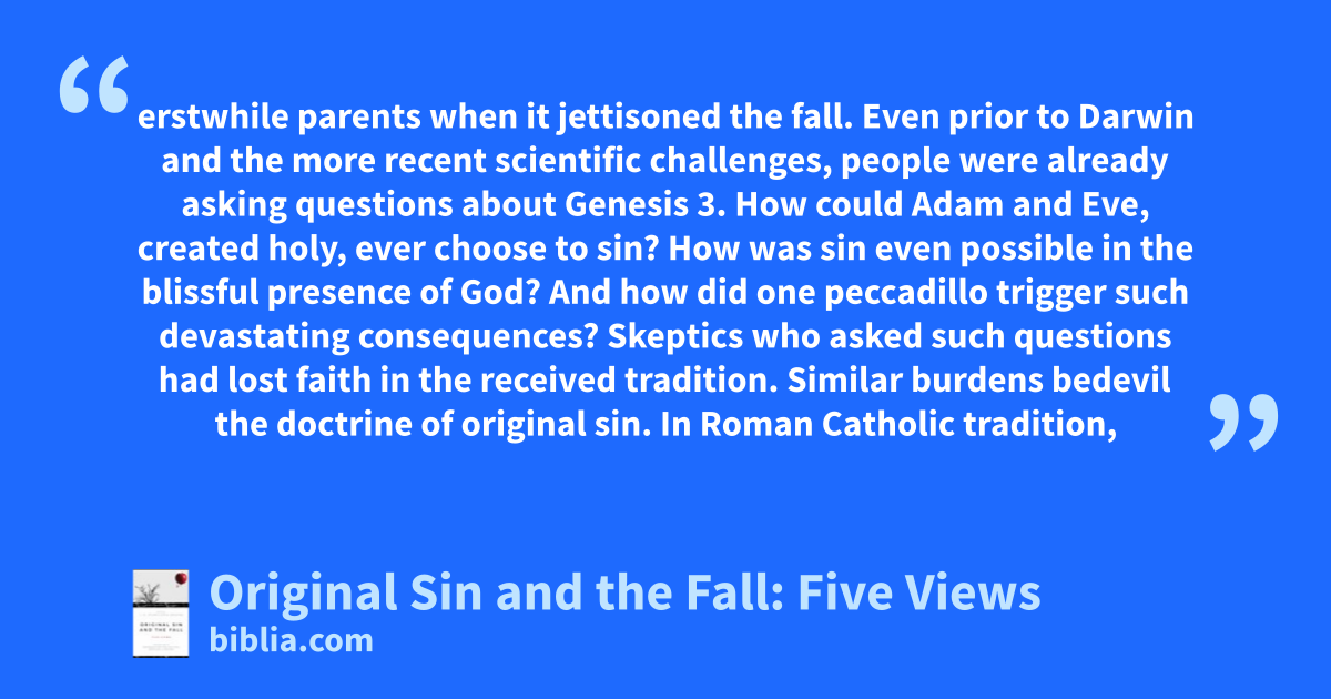 erstwhile parents when it jettisoned the fall. Even prior to Darwin and the more recent scientific challenges, people were already asking questions about Genesis 3. How could Adam and Eve, created holy, ever choose to sin? How was sin even possible in the blissful presence of God? And how did one peccadillo trigger such devastating consequences? Skeptics who asked such questions had lost faith in the received tradition. Similar burdens bedevil the doctrine of original sin. In Roman Catholic tradition,