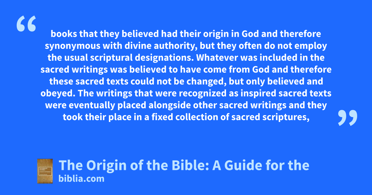 books that they believed had their origin in God and therefore synonymous with divine authority, but they often do not employ the usual scriptural designations. Whatever was included in the sacred writings was believed to have come from God and therefore these sacred texts could not be changed, but only believed and obeyed. The writings that were recognized as inspired sacred texts were eventually placed alongside other sacred writings and they took their place in a fixed collection of sacred scriptures,