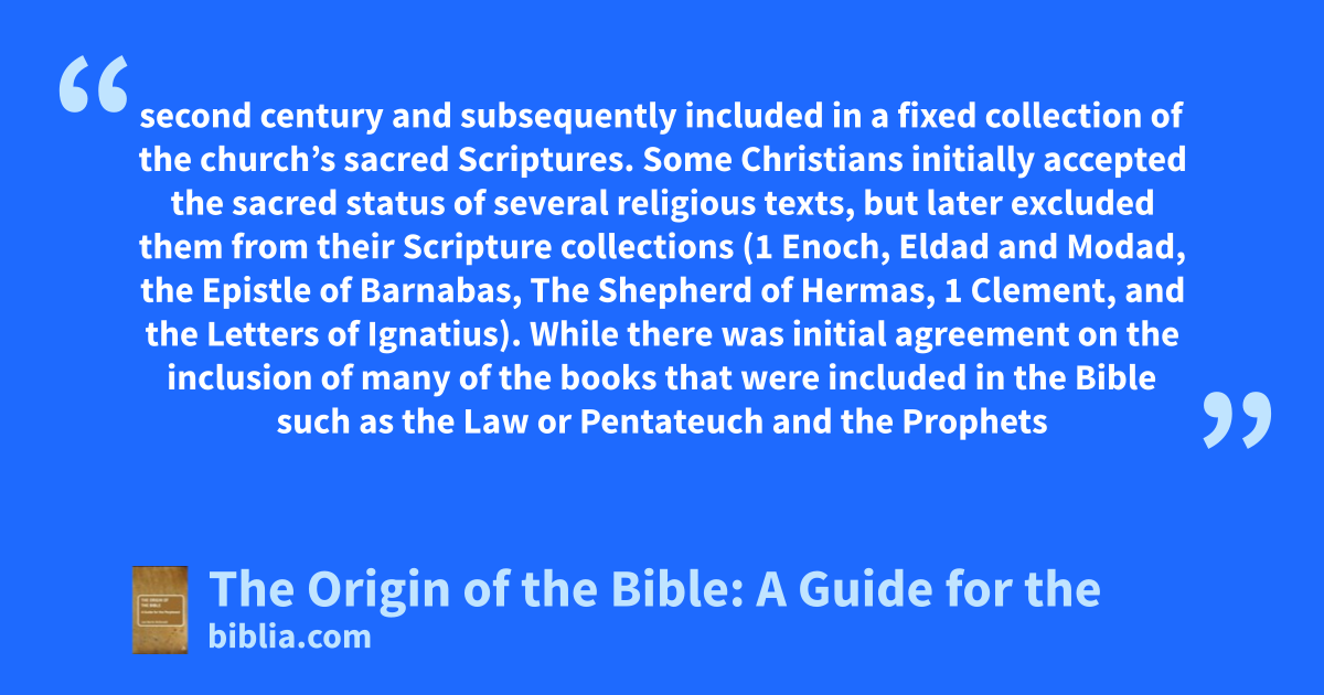 second century and subsequently included in a fixed collection of the church’s sacred Scriptures. Some Christians initially accepted the sacred status of several religious texts, but later excluded them from their Scripture collections (1 Enoch, Eldad and Modad, the Epistle of Barnabas, The Shepherd of Hermas, 1 Clement, and the Letters of Ignatius). While there was initial agreement on the inclusion of many of the books that were included in the Bible such as the Law or Pentateuch and the Prophets
