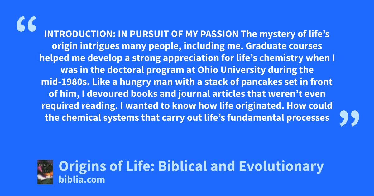 INTRODUCTION: IN PURSUIT OF MY PASSION The mystery of life’s origin intrigues many people, including me. Graduate courses helped me develop a strong appreciation for life’s chemistry when I was in the doctoral program at Ohio University during the mid-1980s. Like a hungry man with a stack of pancakes set in front of him, I devoured books and journal articles that weren’t even required reading. I wanted to know how life originated. How could the chemical systems that carry out life’s fundamental processes