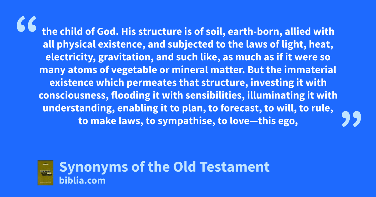 the child of God. His structure is of soil, earth-born, allied with all physical existence, and subjected to the laws of light, heat, electricity, gravitation, and such like, as much as if it were so many atoms of vegetable or mineral matter. But the immaterial existence which permeates that structure, investing it with consciousness, flooding it with sensibilities, illuminating it with understanding, enabling it to plan, to forecast, to will, to rule, to make laws, to sympathise, to love—this ego,
