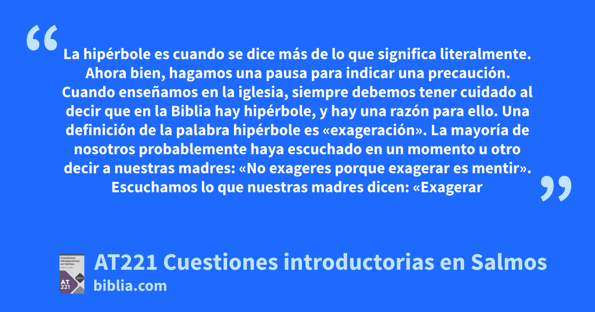 La hipérbole es cuando se dice más de lo que significa literalmente. Ahora bien, hagamos una pausa para indicar una precaución. Cuando enseñamos en la iglesia, siempre debemos tener cuidado al decir que en la Biblia hay hipérbole, y hay una razón para ello. Una definición de la palabra hipérbole es «exageración». La mayoría de nosotros probablemente haya escuchado en un momento u otro decir a nuestras madres: «No exageres porque exagerar es mentir». Escuchamos lo que nuestras madres dicen: «Exagerar