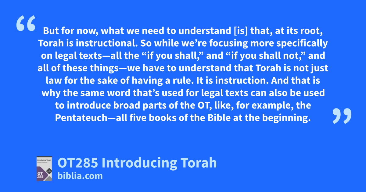 But for now, what we need to understand [is] that, at its root, Torah is instructional. So while we’re focusing more specifically on legal texts—all the “if you shall,” and “if you shall not,” and all of these things—we have to understand that Torah is not just law for the sake of having a rule. It is instruction. And that is why the same word that’s used for legal texts can also be used to introduce broad parts of the OT, like, for example, the Pentateuch—all five books of the Bible at the beginning.
