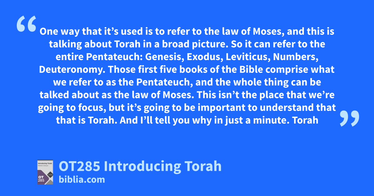One way that it’s used is to refer to the law of Moses, and this is talking about Torah in a broad picture. So it can refer to the entire Pentateuch: Genesis, Exodus, Leviticus, Numbers, Deuteronomy. Those first five books of the Bible comprise what we refer to as the Pentateuch, and the whole thing can be talked about as the law of Moses. This isn’t the place that we’re going to focus, but it’s going to be important to understand that that is Torah. And I’ll tell you why in just a minute. Torah