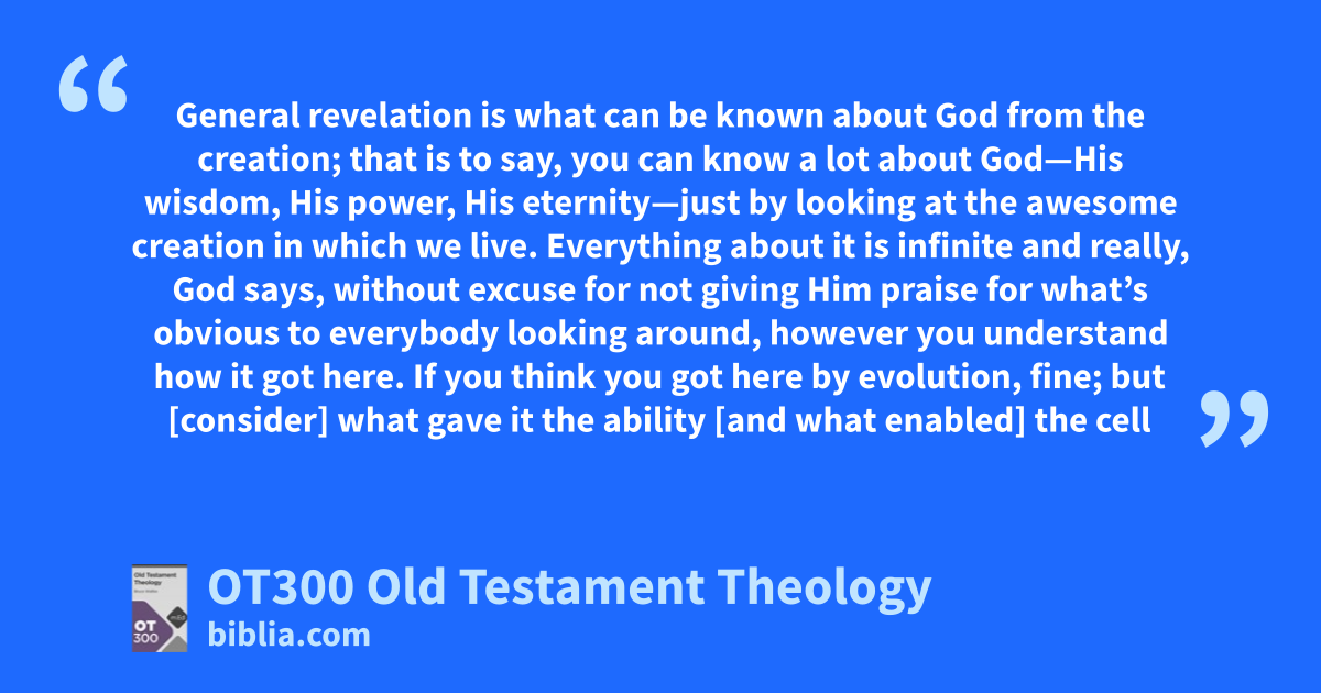 General revelation is what can be known about God from the creation; that is to say, you can know a lot about God—His wisdom, His power, His eternity—just by looking at the awesome creation in which we live. Everything about it is infinite and really, God says, without excuse for not giving Him praise for what’s obvious to everybody looking around, however you understand how it got here. If you think you got here by evolution, fine; but [consider] what gave it the ability [and what enabled] the cell