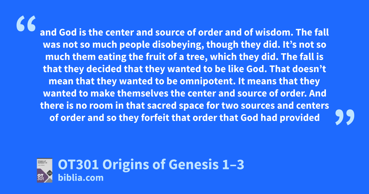 and God is the center and source of order and of wisdom. The fall was not so much people disobeying, though they did. It’s not so much them eating the fruit of a tree, which they did. The fall is that they decided that they wanted to be like God. That doesn’t mean that they wanted to be omnipotent. It means that they wanted to make themselves the center and source of order. And there is no room in that sacred space for two sources and centers of order and so they forfeit that order that God had provided