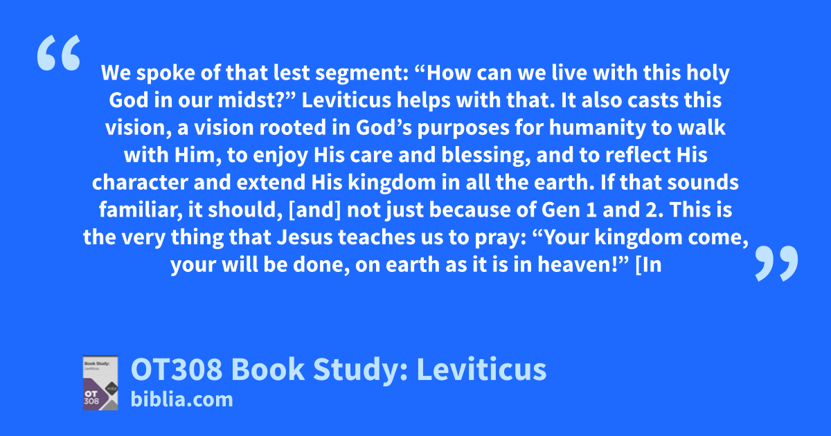 We spoke of that lest segment: “How can we live with this holy God in our midst?” Leviticus helps with that. It also casts this vision, a vision rooted in God’s purposes for humanity to walk with Him, to enjoy His care and blessing, and to reflect His character and extend His kingdom in all the earth. If that sounds familiar, it should, [and] not just because of Gen 1 and 2. This is the very thing that Jesus teaches us to pray: “Your kingdom come, your will be done, on earth as it is in heaven!” [In