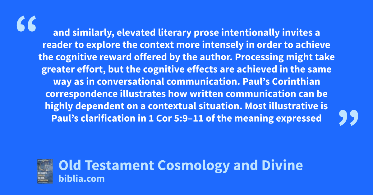and similarly, elevated literary prose intentionally invites a reader to explore the context more intensely in order to achieve the cognitive reward offered by the author. Processing might take greater effort, but the cognitive effects are achieved in the same way as in conversational communication. Paul’s Corinthian correspondence illustrates how written communication can be highly dependent on a contextual situation. Most illustrative is Paul’s clarification in 1 Cor 5:9–11 of the meaning expressed